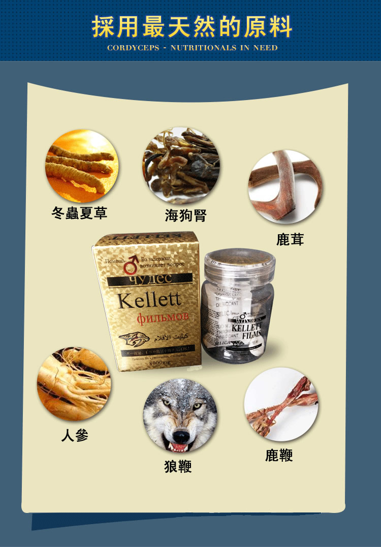 【主要成分】:海狗腎、海馬鞭、鹿茸、鹿鞭、狼鞭、冬蟲夏草、人參、鎖陽、雪蓮、紅景天、枸杞子等。