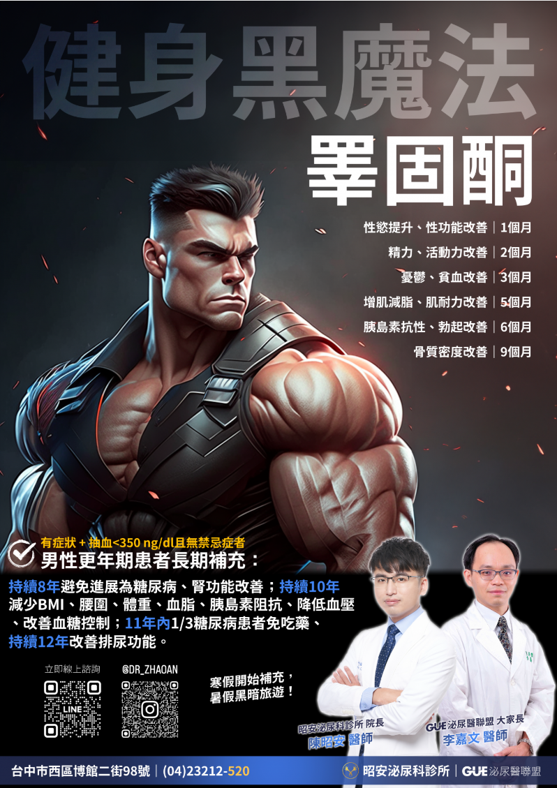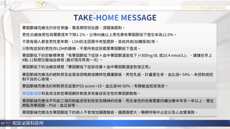 使用期間應定期追蹤血中睪固酮濃度、肝腎功能與前列腺狀況。