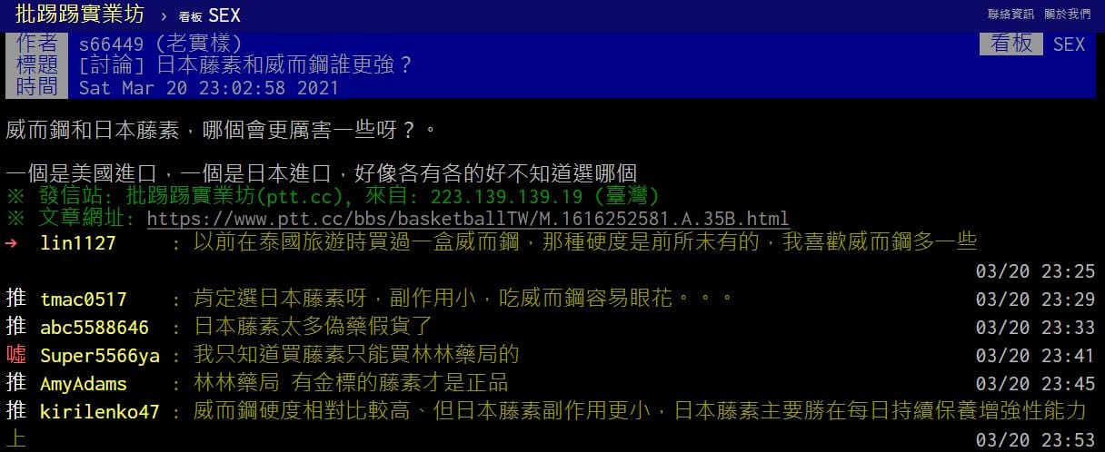 在ptt上,有很多人對比了藤素和威而鋼。令人驚訝的是,日本藤素也成為了網民討論的話題。其中,nirilsnko47這位網民的回答最為精彩:“威而鋼的硬度相對較高,但是日本藤素的副作用更小,其主要優勢在於每天持續保養和增強性能力!”
